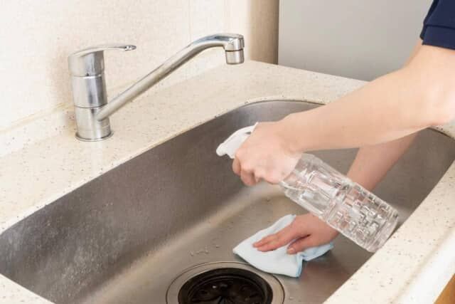 ステンレスシンクにうっすらと浮かぶ白い汚れ、実は水道水のカルキや石けんカス。スポンジでこすってもなかなか落ちない…そんなときは、クエン酸水(スプレー1本:水200ml+クエン酸小さじ1)を吹きかけ、ラップで密着して5分放置。