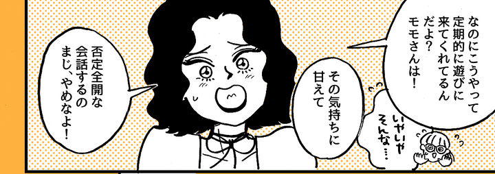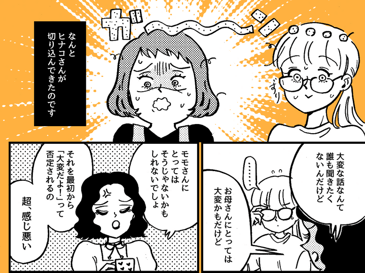 義妹のヒナコさんが切り込んできたのです。「大変な話なんて聞きたくないでしょ、誰だって。お母さんにとっては大変かもだけど、モモさんにとってはそうじゃないかもしれないし。最初から、大変だよ! って否定されるの、超感じ悪い」なんとヒナコさんが義母に説教をしてくれたのです!