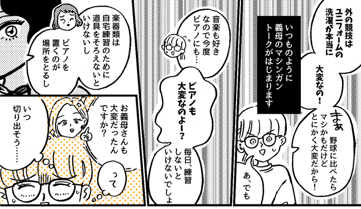 みんなで世間話をしていると、また義母の「大変マウント」トークが始まったのです。私は友人にもらったアドバイスを実践しようとタイミングを見計らっていたのですが……義母に、ヒナコさんからの痛烈なひと言が入ったのです!