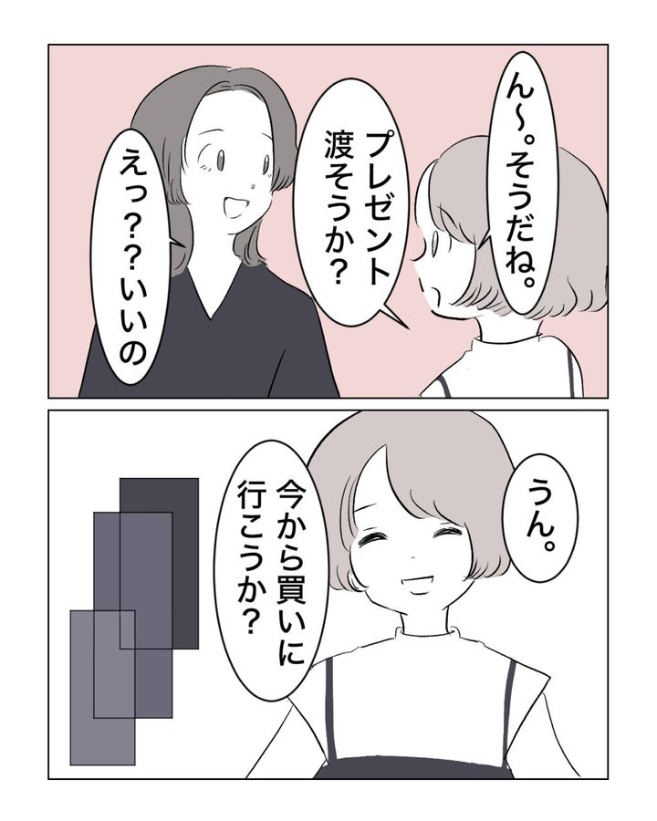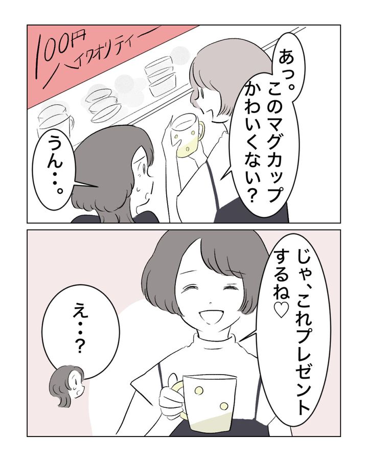 「あっ、このマグカップかわいくない?」ホノカさんの言葉に、「うん・・」と動揺するルナさん。「じゃ、これプレゼントするね」笑顔でそう言うホノカさんに、「え・・?」とルナさんは動揺しました。