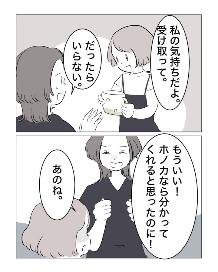 「私の気持ちだよ。受け取って」そう言ってマグカップを差し出すと、「だったらいらない」と即答した後、「もういい!ホノカなら分かってくれると思ったのに!」と大きな声で言うルナさん。ホノカさんは「あのね」とルナさんに声をかけました。