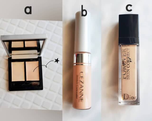 ▲(a)&be「ファンシーラー」 ベージュ&オレンジ ¥3,850(税込)、(b)セザンヌ「ストレッチコンシーラー」 30(オレンジ系) ¥660(税込)、(c)ディオール「フォーエヴァースキンコレクトコンシーラー」 ¥5,720(税込)