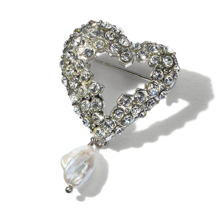 ガラスを敷き詰めたハート形に、揺れるパールをドッキングした技ありデザイン。デニムやモノトーンスタイルに取り入れて、さりげなくリッチ感を漂わせて。