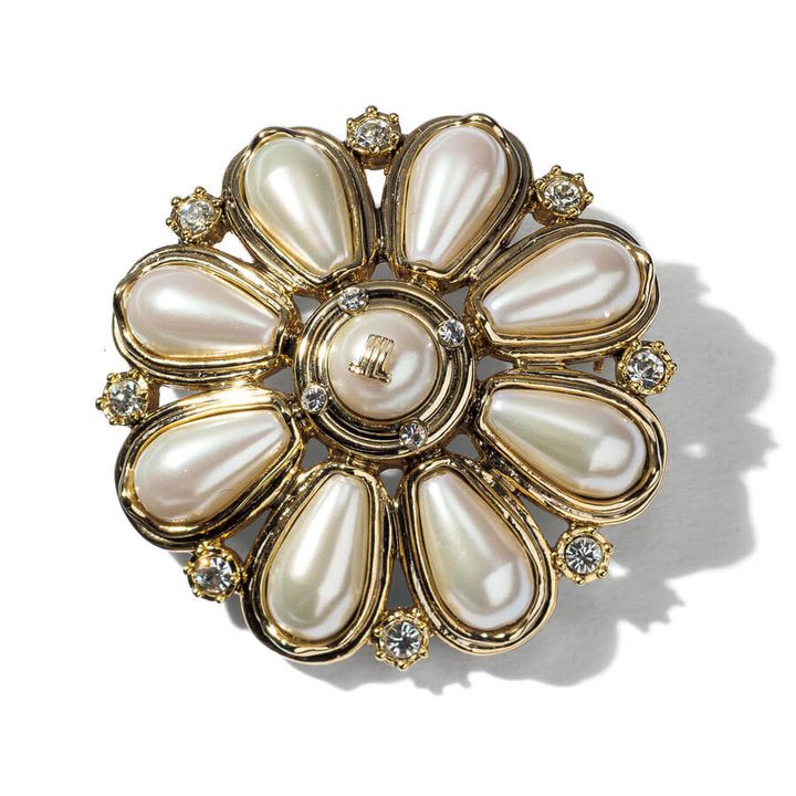 しずく形のパールでマーガレットの花びらを模ったブローチは、華やかで存在感抜群。オケージョンにも重宝。