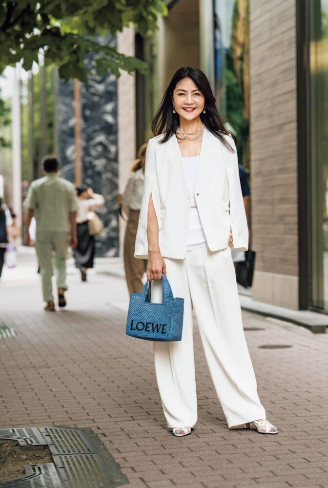 「ロエベ」のブルーのラフィアトートをオールホワイトのポイントに。ストラップで斜めがけできるところも気に入っています」