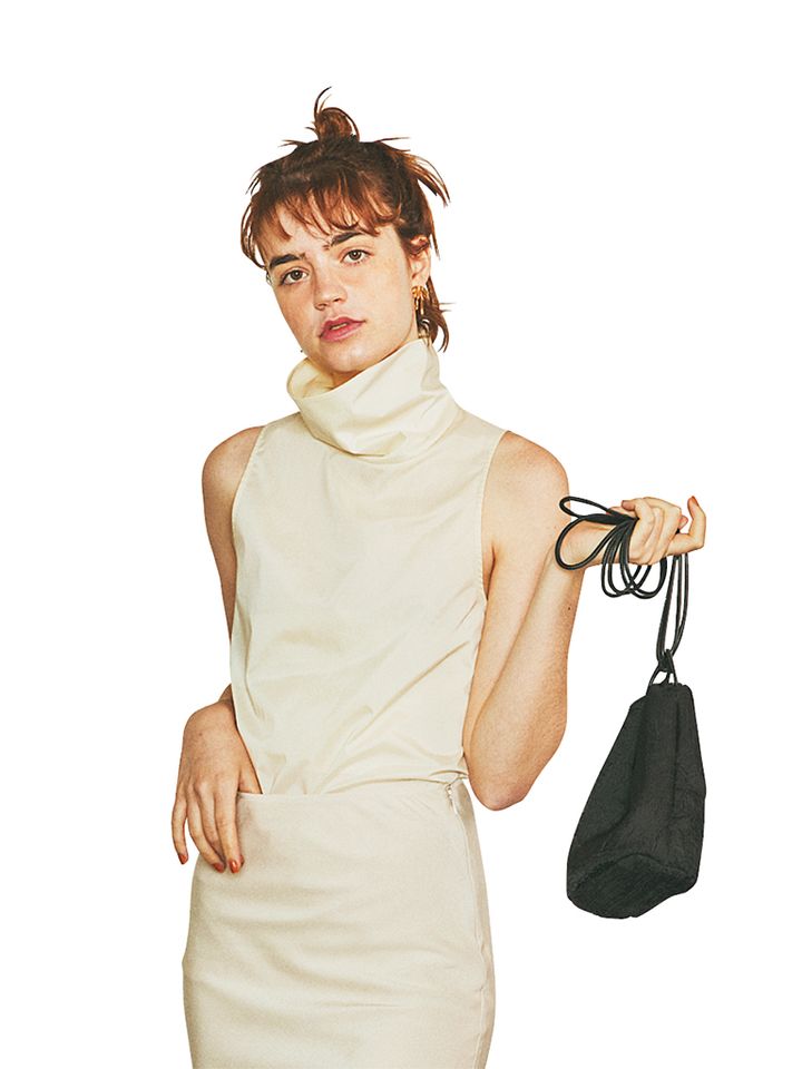アイボリーハイネックブラウス/TODAYFUL(Life’s 代官山店) スカートは着まわし。ピアス 1,980円/アネモネ(サンポークリエイト) 巾着バッグ 6,490円/MANOF たっぷりとしたネックがあご下までかかり、センシュアルなノースリをモードに誘導。光沢生地でより洗練された姿へ。