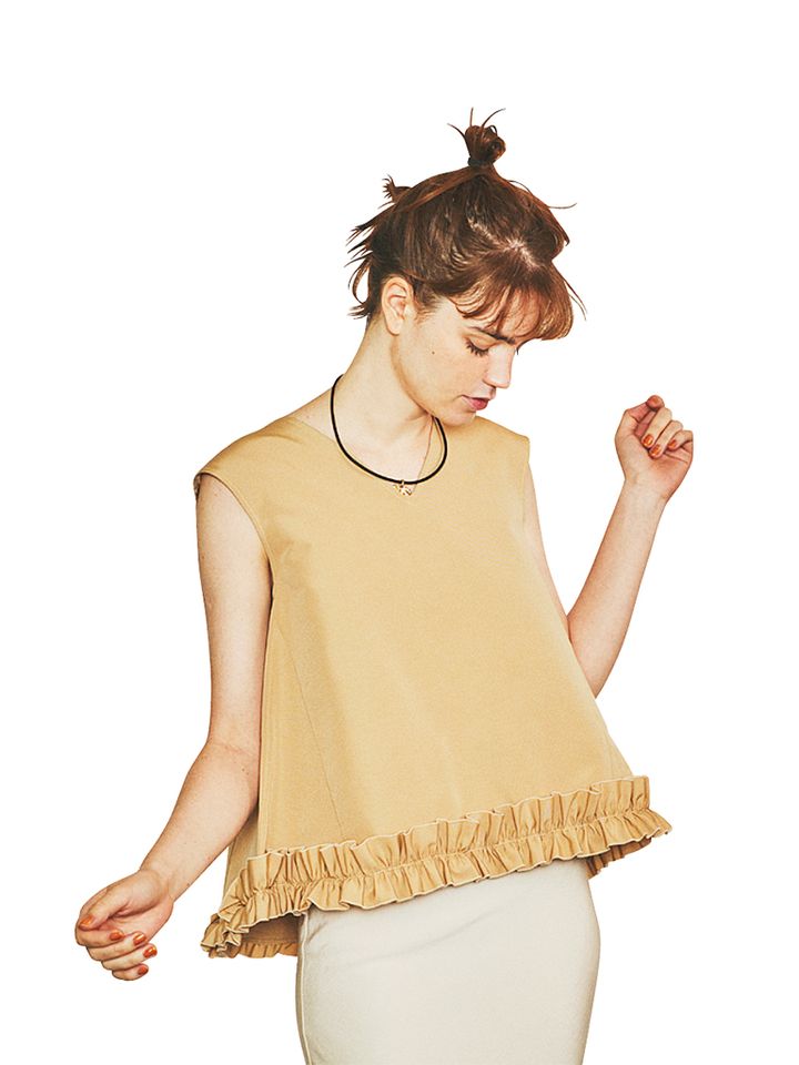 ベージュフリルブラウス/#Newans(オンワード樫山 お客様相談室) スカートは着まわし。ハートチョーカー 45,320円/DEA DIA(ZUTTOHOLIC) シャリ感のある素材でシワになりにくく、立体的なフレア形状をいつでもキープ。すそを1周するフリルの甘さを鋭いVネックで鎮静。