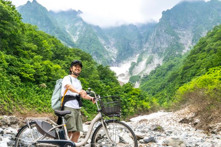 『谷川岳ヨッホ』(ロープウェイの乗り場)でロープウェイには乗らず、電動アシスト付き自転車を借りて一ノ倉と呼ばれる絶景ポイントを目指すのもアリ。一ノ倉にはガイド料500円を払えば無料の電気バスで連れて行ってもいただけますが、お天気がよくて、自転車に乗れるなら、とってもオススメです。からだで風を感じ、山の空気を胸いっぱいに吸いながら絶景を目指すのは、思い出にも残る体験!
