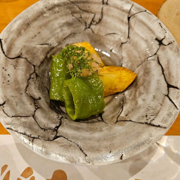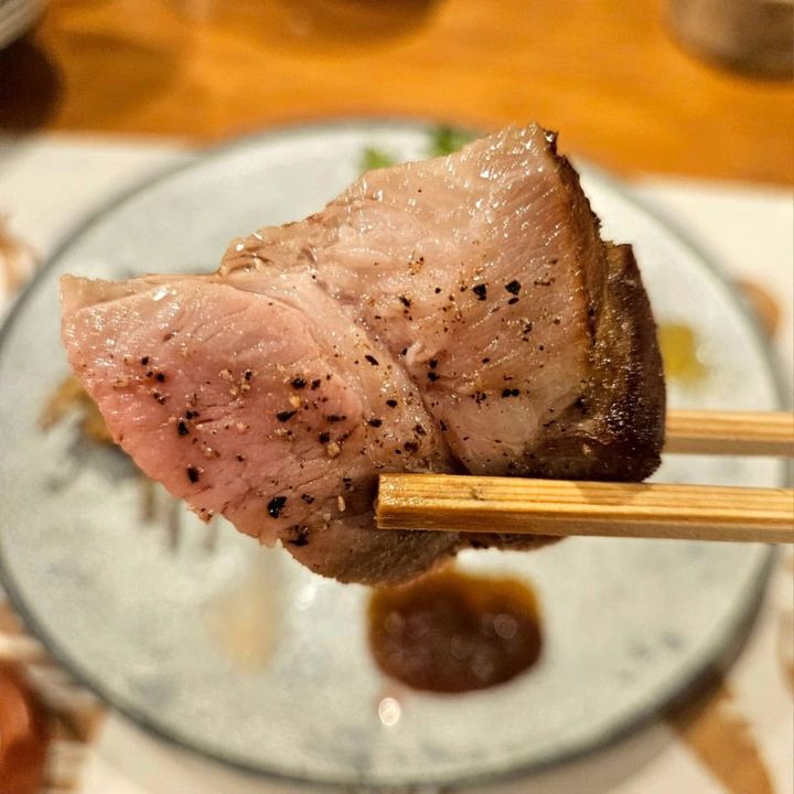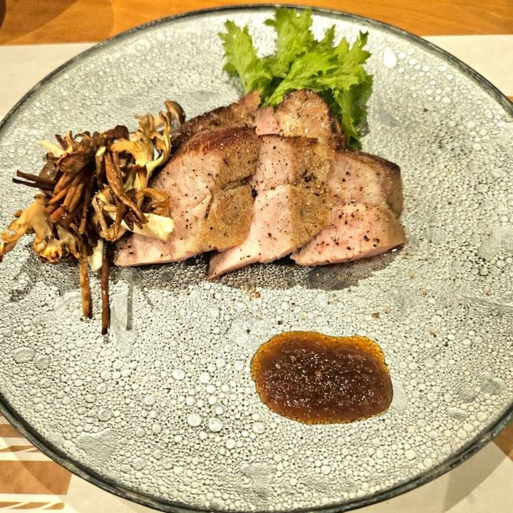 こちらは『尾瀬豚の燻し焼き』桜のチップで燻された豚肉に、お好みで柚子とんがらしをつけていただきます。大変に好みですのでしっかりつけました。