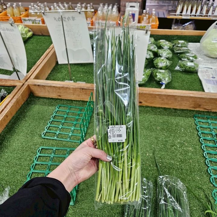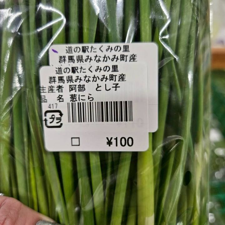 道の駅でおみやげを買うこともできますし、地元の野菜を買うこともできます。美味しそうな葱ニラを発見。たくさん入って価格は、ええと……、