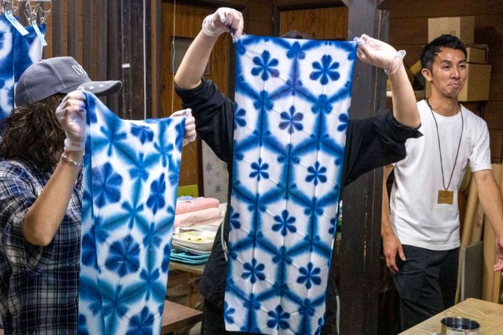 こんなふうに、手ぬぐいを染めることができます(体験料金は1,500円)。力の入れ具合で染まり具合が変わるから超楽しい!
