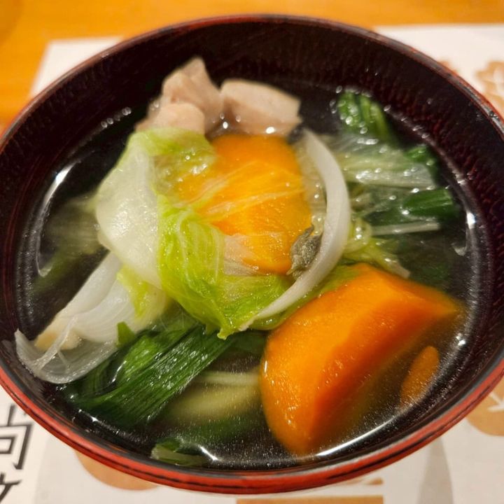 こちらが野菜たっぷりの『薬膳鍋』。お椀の中にしょうが、クコの実、まいたけ、しいたけ、ニラ、水菜、青梗菜、たもぎ茸、鶏肉などがごっそり入った野菜たっぷりのお椀。お味は鶏ガラベースの優しいお味です。