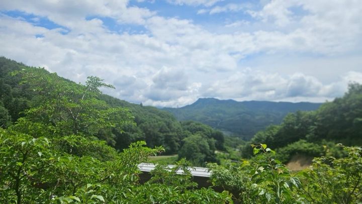 上毛高原駅近くのさなざわ㞢テラス(コワーキング&温浴施設)のテラスからの景色。たった1時間11分、新幹線に乗っただけで「山に来た!」感じ。わー、ほんと近いわ。