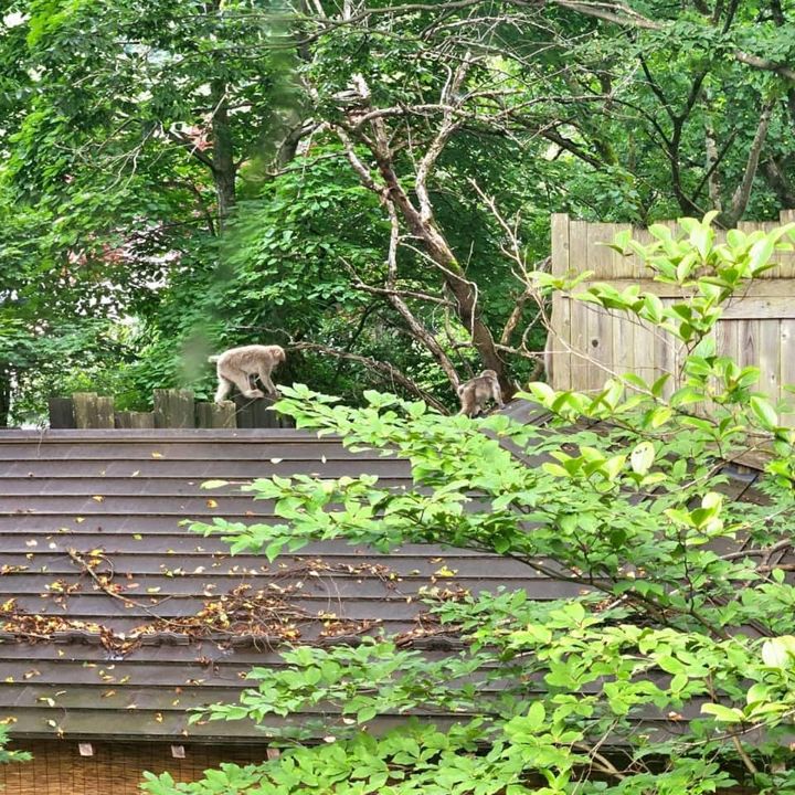 朝は、目の前をおサルさんのご一家が隣の家屋の屋根を走っていきました。