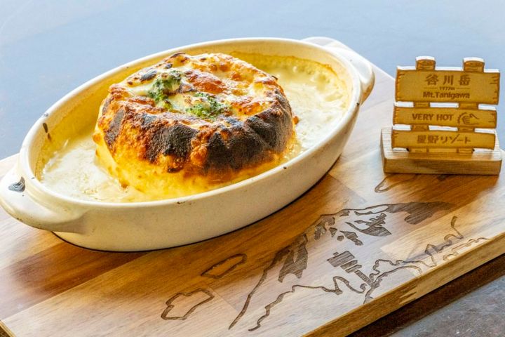 ロープウェイとリフトの乗り継ぎ地にあるレストラン『ビューテラスてんじん』では、新名物の「谷川岳パングラタン」もいただけます。ソースが倍量使われているこちら、かなりオススメ!