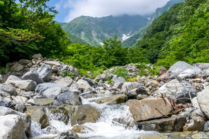 谷川岳をのぞむ「マチガ沢」も絶景の撮影ポイントのひとつ。沢の周辺って、夏は天然クーラーかってくらい涼しいんです。