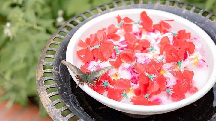 飼育舎には本物のお花もたくさんありますが、お皿のところで休んでいる蝶もいました!