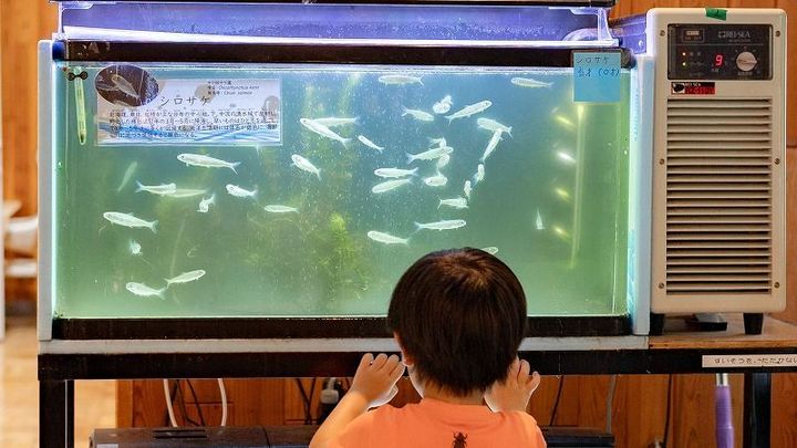 入ってすぐのところにいたシロサケ。生まれたばかりの0歳さんたちです。
