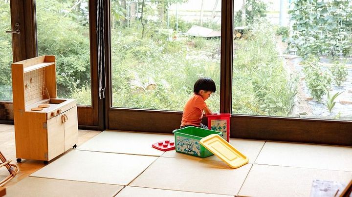 オオムラサキ館のキッズスペース。自然光が入る素敵な場所で、おままごとやブロック遊びができます。