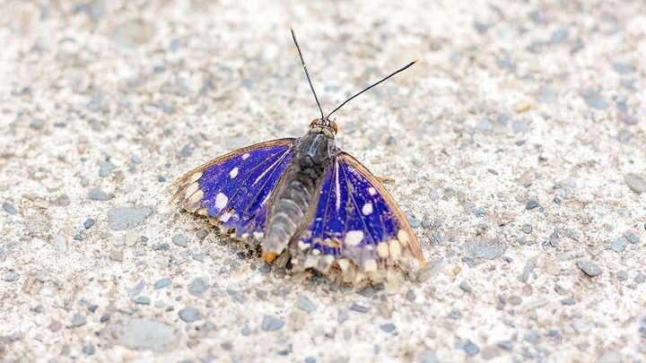 地面に止まっていたオオムラサキ。(羽がちょっとボロボロですが、飼育スタッフさんによると羽化して時間が経つとだんだんボロボロになってしまうのだとか…)