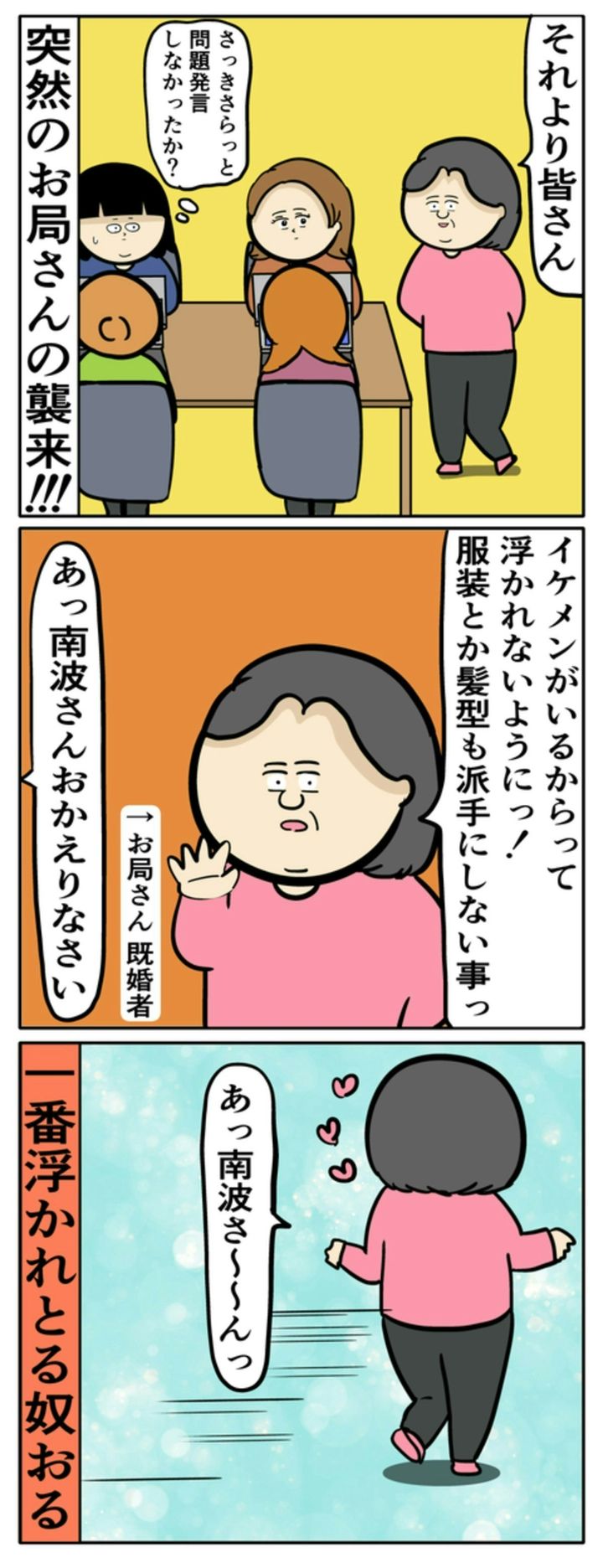 キラキラオーラを放つイケメン社員・「南波さん」が、岡田さんの部署へと異動してきました。女性社員が南波さんの話題で盛り上がっていたところ、すかさずお局が話に割り込んできました。