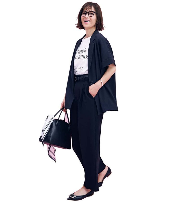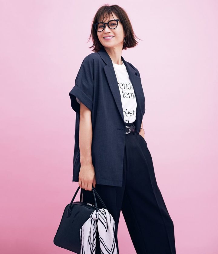 半袖ジャケット¥6,996(ロペピクニック/ジュンカスタマーセンター)ロゴTシャツ¥3,990(アンフィーロ)パンツ¥4,950(BASEMENT online)バッグ¥79,200(メゾン カナウ/ヤマニ)パンプス¥39,600(ピッピシック/ベイジュ)ベルト¥27,500(ニアー ニッポン/ニアー)スカーフ¥6,930(アンタイトル)メガネ¥39,600(プロポ/プロポデザイン)ピアス¥47,300パールネックレス¥46,200(ともにリューク)バングル¥7,560(アビステ)