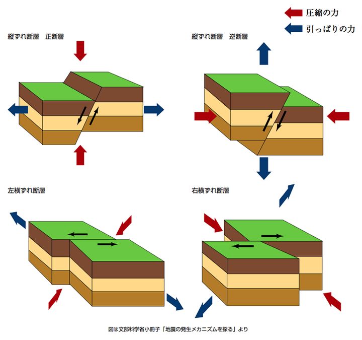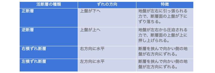 活断層は、主にずれ動く方向によって以下の4つに分類されます。