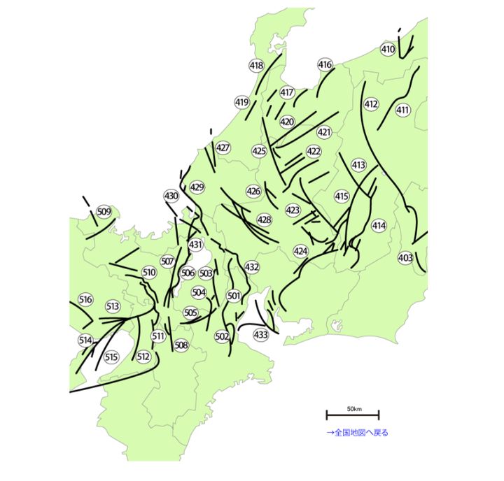 番号をクリックすると、それぞれの断層の長期評価へのリンクが表示されます。