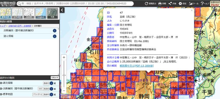 青枠の部分範囲をクリックすると、活断層図に関するデータや情報を閲覧できます。