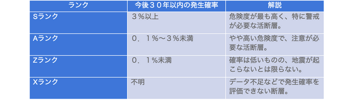 日本の活断層は、今後30年以内に地震が発生する確率に基づいて、4つのランクに分類されています。