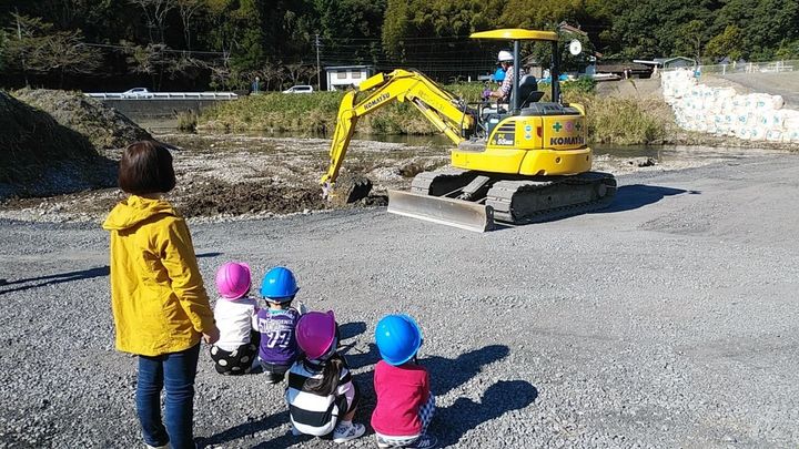 保育園児と重機が写っている写真もステキです。この投稿には「子どもの笑顔で興奮しますね」「ちっさい現場監督たち」といったリプライがついていました。