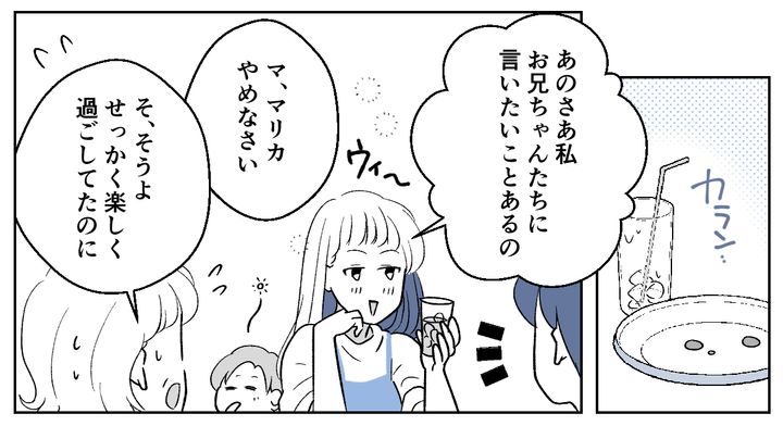 お酒が入っているからでしょう、マリカちゃんは楽しそうに話しています。「お母さんも言ってやりなよ!」と言われた義母は、さっと目をそらしました。察したタカフミが何か言おうとしましたが、それを制止して私が話すことにしました。