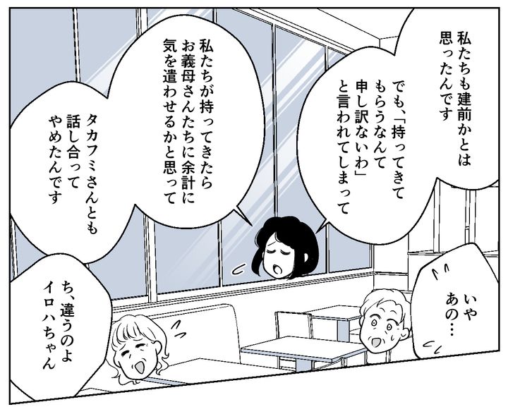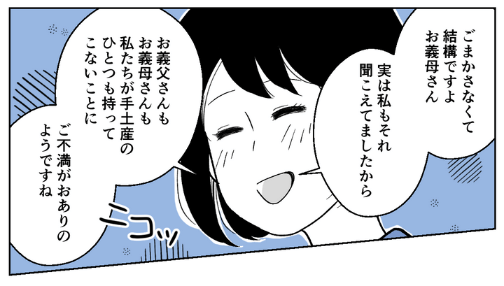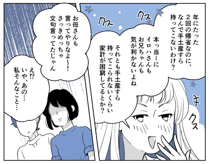 私はイロハ。義妹のマリカちゃん一家と重なった帰省。夕食時、マリカちゃんが手土産について、「お兄ちゃんたちは気が利かない」と不満を漏らました。しかし義両親はその経緯を知っています。庇ってくれるだろうと考えていると、まさかの同調……。私は衝撃を受けました。「手ぶらで」と言ったのは義両親なのに。しかも義父にいたっては、「タカフミが可哀想」とまで言い出したのです。しかしタカフミに話すわけにもいきません。私は困惑してしまいました。