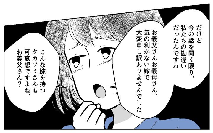 本当は黙っていようかとも思っていましたが、さすがの私も頭にきてしまいました。そこであえて慇懃無礼な口調で、「勘違いだった、本当に申し訳ない」と謝罪してみたのです。しかも義父が陰で言っていた「気が利かない嫁」という皮肉つきで。義両親は青ざめています。