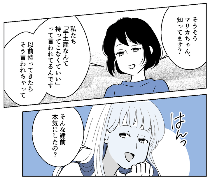 私は、以前手土産を持ってきたときに「今後は持ってこなくていい」と言われたことを話しました。その話を聞いても、義妹は「そんな建前本気にしたの?」と鼻で笑っています。
