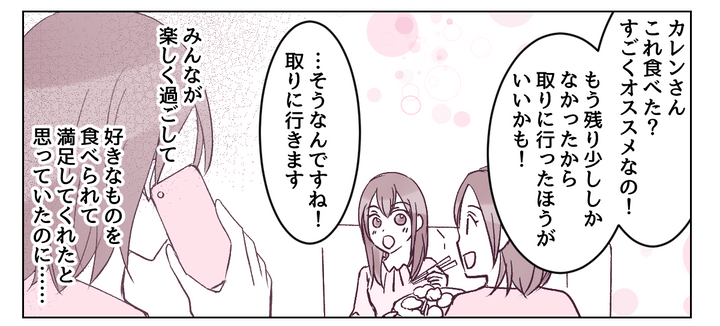 ショウの言葉に驚きます。カレンさんは何度も料理を取りに行っていたし、ケイくんはキッズスペースでうちの子たちと大はしゃぎしていました。みんなが楽しく過ごして、好きなものを食べられて満足してくれたと思っていたのに……。