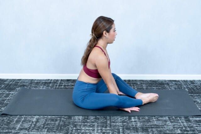 (1)体育座りした状態から両ひざを菱形に開いて足裏をくっつける