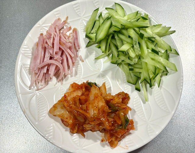 ②きゅうりはせん切りにする。ハムまたは焼豚は細切り、キムチはざく切りにします。