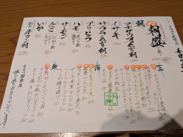 「まるはち料理店」ではグランドメニューと本日のおすすめが味わえます。 さっそく本日のおすすめを拝見。 お店おすすめの刺盛を1人前(2200円~2700円)注文。
