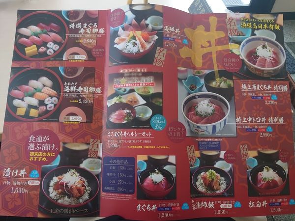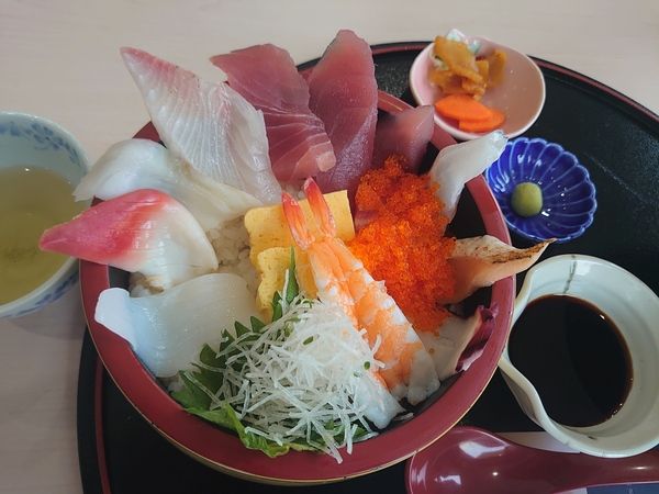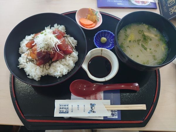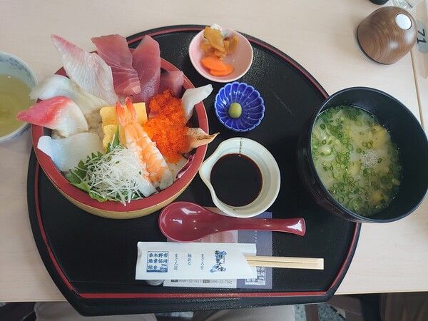 名物は、新鮮なマグロを使用した「漬け丼(1,793円)」「海鮮丼(1,969円)」「極上南マグロ丼 特別膳(3,652円)」「串木野漁師飯(1,793円)」「紅白丼(1,590円)」