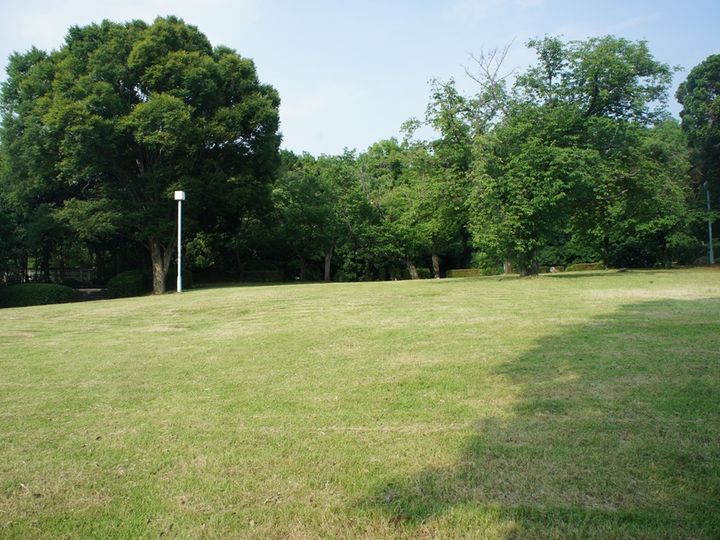 広い芝生を囲むように木陰があり、近くに腰掛けや遊具なども設置されていました。