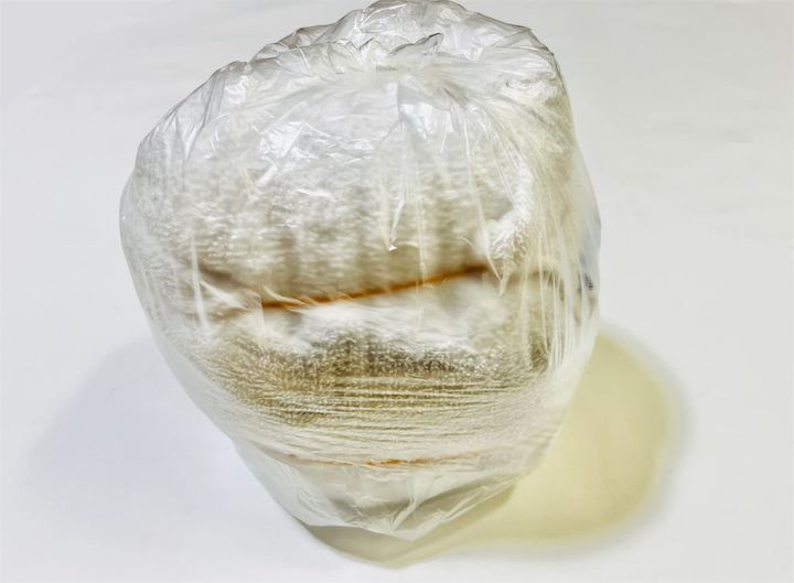 7. 6を大きなタオルで包み、タオルが外れないように数か所を輪ゴムでとめる。さらに、ポリ袋に入れて口を結ぶ。