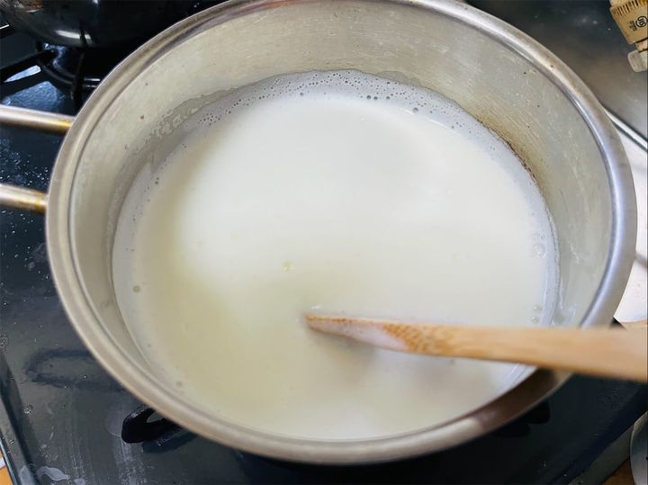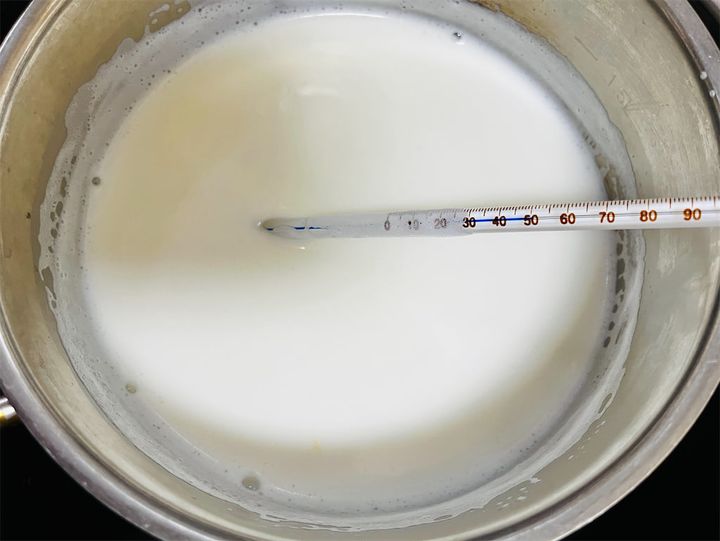 4. 3の牛乳の火をとめ、温度計を入れて50℃になるまで冷ます。