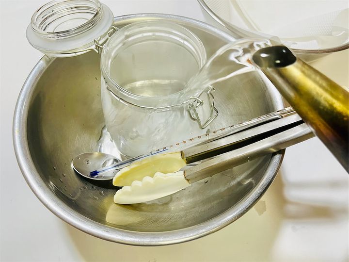 1. 1Lの牛乳が入る耐熱容器、温度計、大きめのスプーン、トングをボウルに入れ、熱湯(分量外)をかけて消毒する。