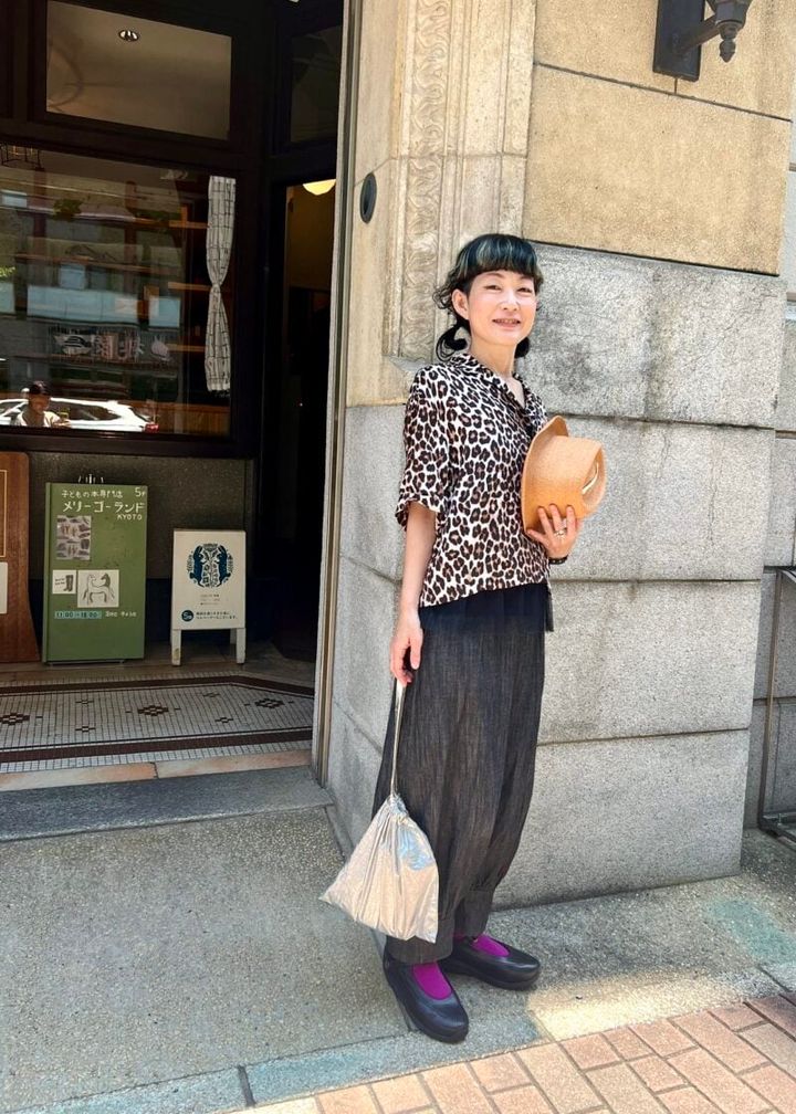 昭和2(1927)年竣工のノスタルジックな意匠を残す壽ビルディング。京都の河原町でも目をひく近代モダン建築で出会った尾﨑良子さん。質感と存在感のあるシルバーメタルカラーのバッグは、ユニフォームのあり方を提案するリトアニア発のデザインスタジオ 「formuniform(フォームユニフォーム)」のもの。「このビルの中で開催されるさまざまなポップアップで服や小物を見つけるのが楽しみなんです」。