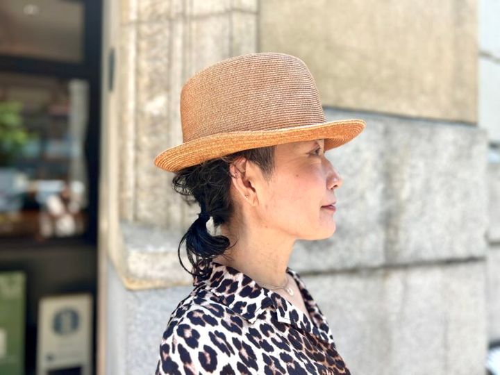 職人のフルハンドメイドで仕上げる「BoUBoU(ボウボウ)」の帽子で、夏を乗り切る。「毎日自転車に乗るので、つばの短いものを選んで、あご紐になるリボンをつけてもらいました。初めていい帽子を買ったので、大切にしたいです」。