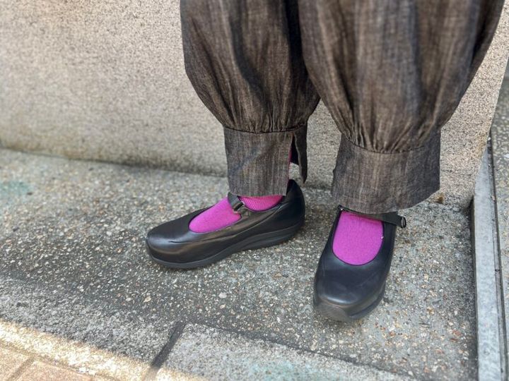お気に入りのアラジンパンツに、紫の靴下がとってもキュート!「cico&salo(チコアンドサロ)」は大阪のブランドで、身につけることが楽しくなる服なんだとか。