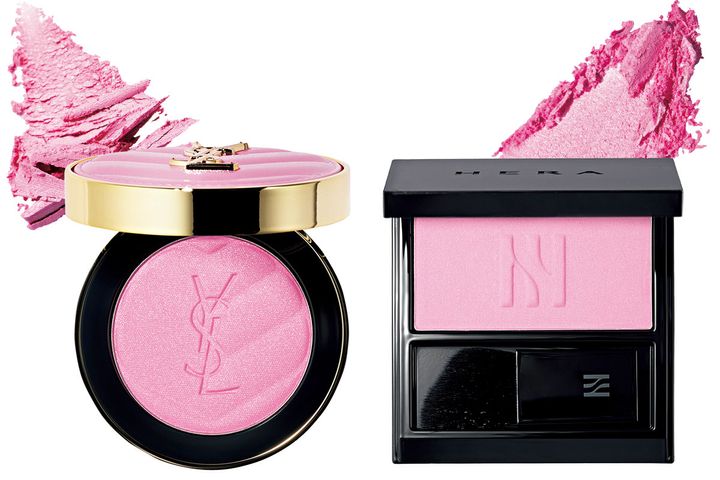 黄みローズのチークの上にシアーな青みピンクチークを重ねると、透明感がアップ。ルースパウダーのようにぼかさなくてもいいチークが最適です。左:【モデル使用】サテンのようなツヤピンク。YSLメイクミーブラッシュ パウダー 42 ¥8,360(イヴ・サンローラン・ボーテ)右:シルキーでなめらかな使い心地。HERA ブラッシュ 77 ¥5,390(HERA)