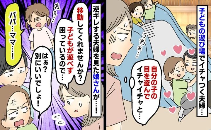 1年前の話です。ある日、家族で室内の遊び場に行くと、周りの視線を一切気にせずイチャイチャしている夫婦がいました。行動は徐々にエスカレートし、ついには迷惑な発言まで。困っていると、「パパ! ママ!」と叫ぶ女の子の声が……。