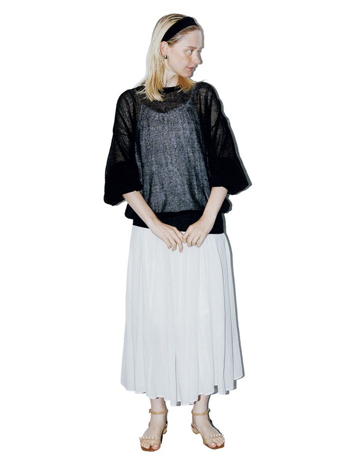 【POINT】やわらかい白がほんのり透け、トップスが奥ゆかしさを生むフィルターのように作用。シアー素材で抜け感を出せるから、ボリュームワンピにレイヤードしても膨張を回避できる。